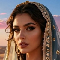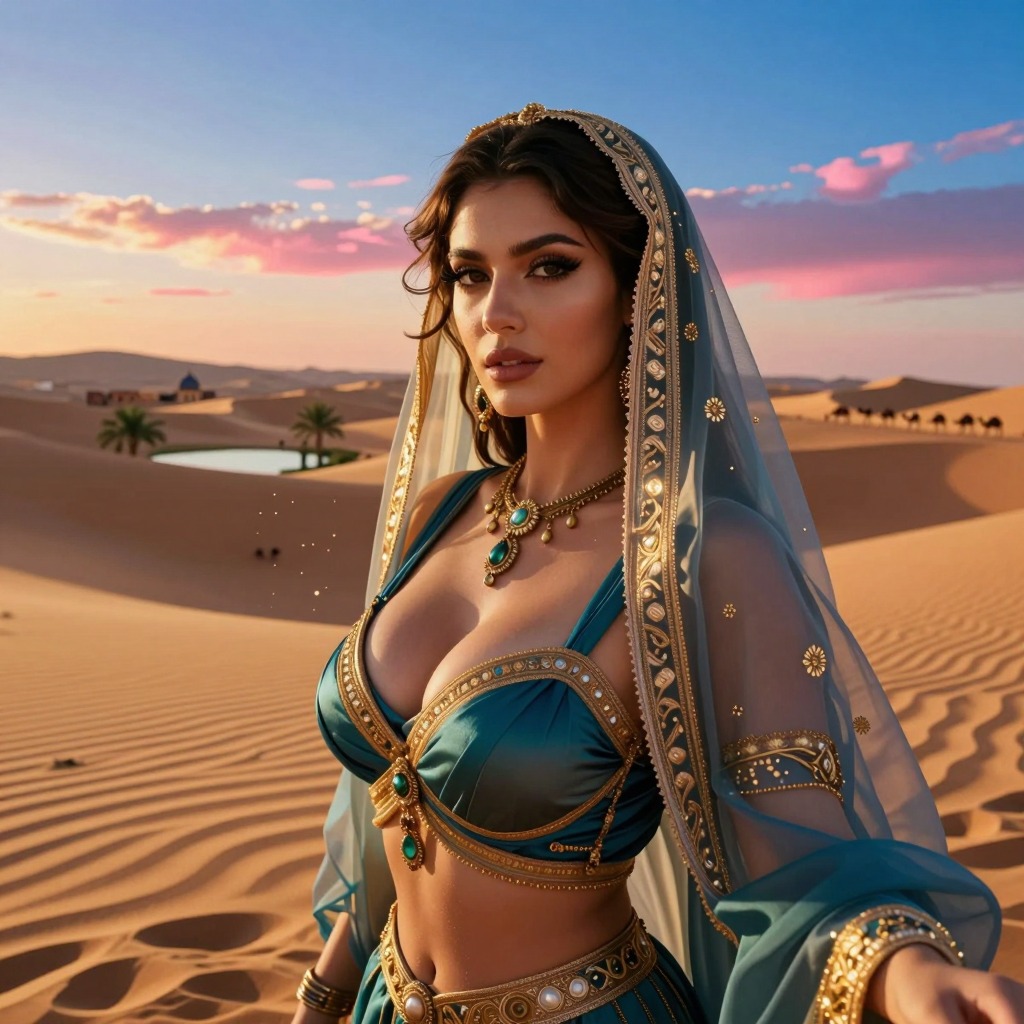 AI Prompt: An ultra-realistic, cinematic portrait of a beautiful brunette woman wearing an elegant veil and traditional attire, standing in a stunning desert landscape at golden hour, showcasing her voluptuous build and intricate details with a magical, regal, and alluring mood, captured with photorealistic detail.