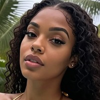 AI Prompt: An African-American woman with long curly hair and an athletic build wears sporty black thongs and a sport bra on a sunny tropical beach surrounded by palm trees, showing off her wide hips and muscular arms with a confident, slightly playful expression.